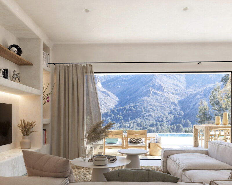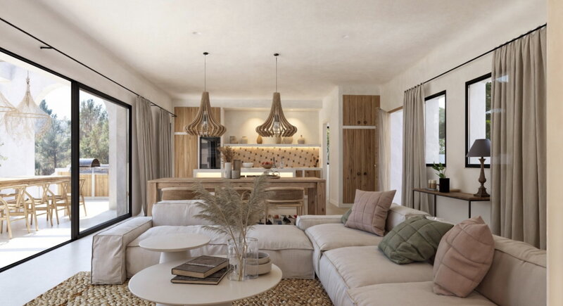 A truly stunning Ibizan style villa with panoramic South facing mountain views. This villa is full of character and is spread over just one floor with a massive 89m2 of terrace with private pool and bbq zone.